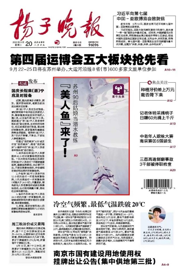 9月20日,扬子晚报刊登文章《美人鱼来了!苏州90后姑娘当潜水教练》,深入报道我校优秀校友郭芮。