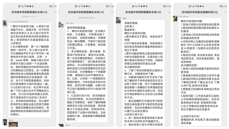 群面模拟实战、简历技巧团辅和面试技巧团辅中,授课老师以大量真实案例为基础,引导学生对求职全过程进行模拟与复盘,学生表示通过定位问题、明晰方向找准路径,能有效掌握应聘技巧避开求职误区锁定求职目标。