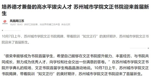 10月7日上午,苏州城市学院文正书院揭牌,带着院训“知文正行”的美好期许,苏州城市学院文正书院迎来了首届新生。