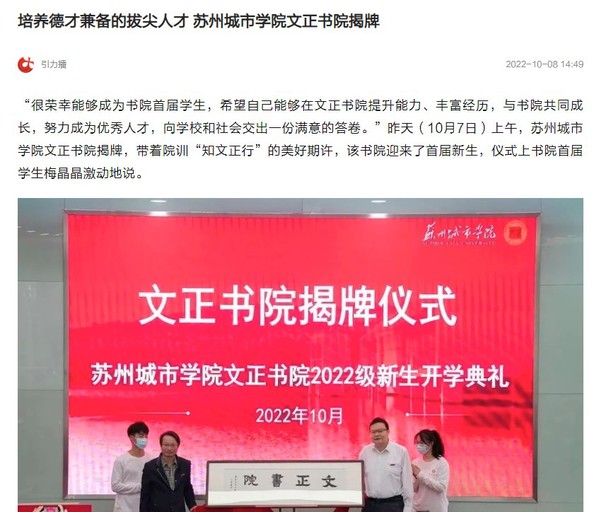 “文正书院是苏州城市学院围绕新工科、新文科建设要求,以培养兼具科学精神和人文素养的高水平人才为目标,打造的拔尖创新育人平台。”苏州城市学院校长赵志宏说,他勉励新生们以院训为指引,乘风破浪,奋勇笃行,做勇立潮头的逐梦青年,既做勤勉求知的奋斗者,也做踏实践行的开拓者,与同辈合作共赢,与时代同步共鸣。