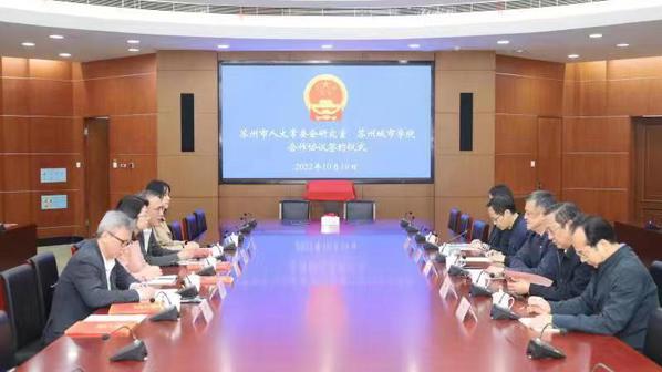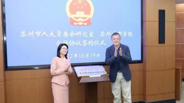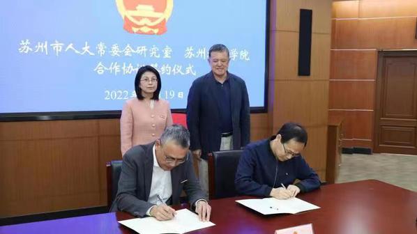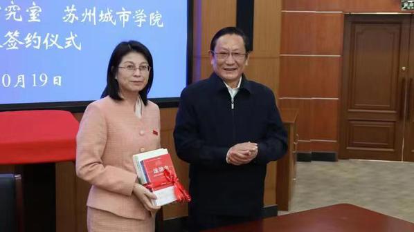 10月19日下午,我校与苏州市人大常委会研究室签署合作协议,共同推进在人才培养、科学研究、党的建设等方面的协同创新,助推我校国内一流高水平应用型大学建设,赋能地方经济社会高质量发展。苏州市人大常委会秘书长黄戟、苏州市人大智库首席顾问高志罡、苏州市人大常委会研究室主任李远延、苏州市人大常委会研究室副主任刘海龙,我校党委副书记周玉玲,党委常委、副校长黄涧秋,发展办负责人张海洋,文正书院涂小马教授等出席签约仪式。仪式由苏州市人大常委会研究室主任李远延主持。