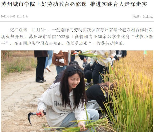 苏州城市学院教务处负责人施盛威表示,党的二十大报告提出,要全面推进乡村振兴,坚持农业农村优先发展,加快建设农业强国。此次劳动实践课程不仅让学生们体验到农作物收割过程,也让大家对乡村振兴、农业强国建设有了更加直观的了解。