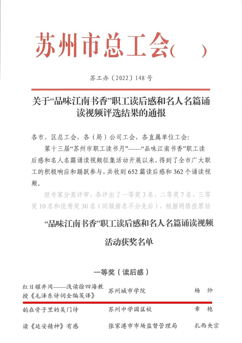 根据苏州市总工会《关于开展“品味江南书香”职工读后感和名人名篇诵读视频征集活动的通知》,我校教职工积极参与,党委组织部(党校)杨帅老师的《红日耀井冈——浅读徐四海教授<毛泽东诗词全编笺译>》作品从645篇参赛作品中脱颖而出,荣获一等奖。