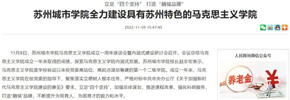 11月8日,苏州城市学院马克思主义学院成立一周年座谈会暨内涵式建设研讨会召开,会议总结马克思主义学院成立一年来取得的成绩,探索马克思主义学院内涵式发展。苏州城市学院校长赵志宏表示,马克思主义学院是学校转设以来校党委高站位、高起点谋划筹建的第一个二级学院。成立一年来,马克思主义学院在校党委的指导下,聚焦落实立德树人根本任务,严格对标中共中央办公厅《关于加强新时代马克思主义学院建设的意见》要求,立足“四个坚持”,加强总体谋划,推进课程改革,强化科研服务,打造“融城”品牌,不断提升为党育人、为国育才的能力和水平。
