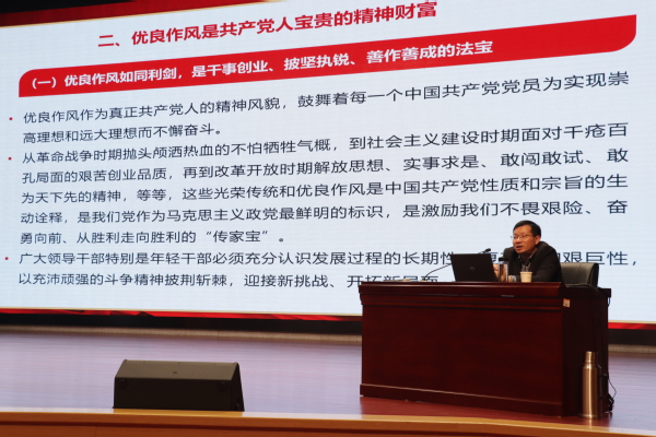 唐强奎从习近平总书记主讲的四堂“第一课”,优良作风是中国共产党人宝贵的精神财富、把握好新时代党员作风建设的内涵与要求、“两个务必”到“三个务必”的作风转变等四个方面重点阐述了新时代加强党的作风建设的重要性。