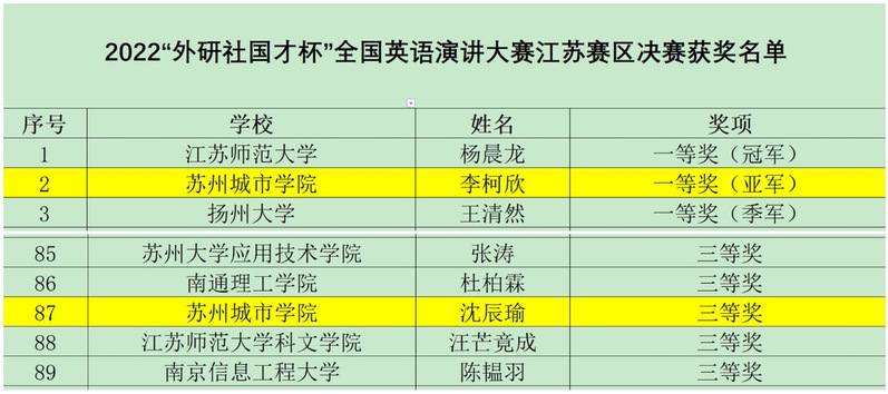 11月4日至6日,2022年“外研社·国才杯”全国英语演讲大赛江苏省决赛于线上成功举行。我校城市文化与传播学院2021级英语转本专业学生李柯欣、沈辰瑜在此次比赛中分别获得省级一等奖(亚军)和三等奖的佳绩。