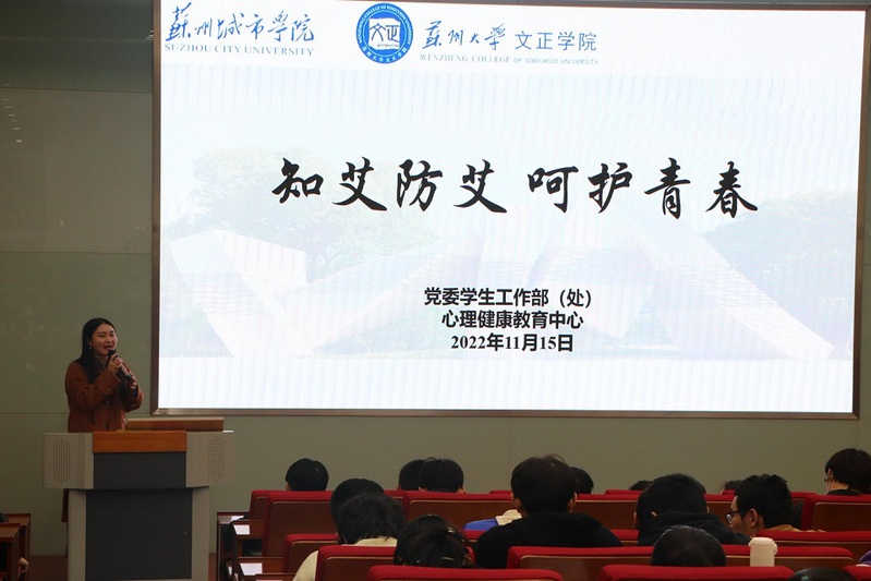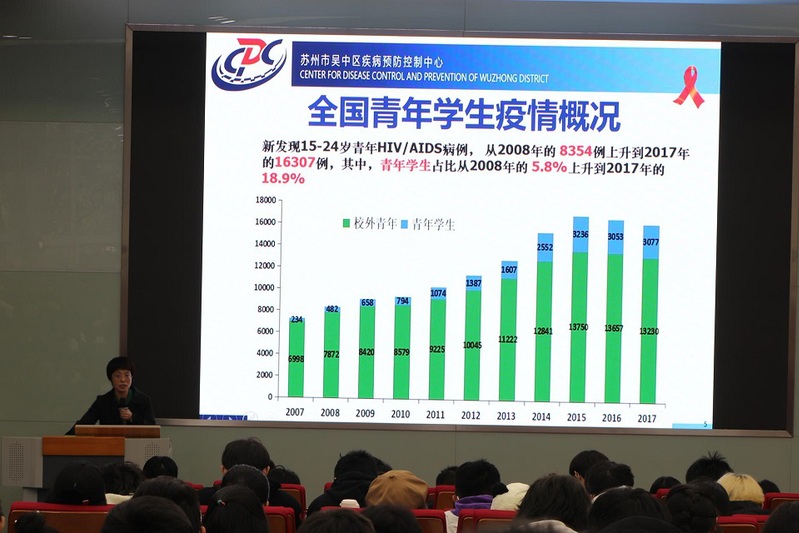 为进一步加大知艾防艾宣传力度,提高大学生对艾滋病的正确认识,增强预防艾滋病的重要意识,我校心理健康教育中心于11月15日下午在3号教学楼101室举办“知艾防艾,呵护青春”讲座。本次讲座由苏州市吴中区疾病预防控制中心慢性传染病防制科科长陶毓新主讲,心理健康教育中心潘芝颖主持。