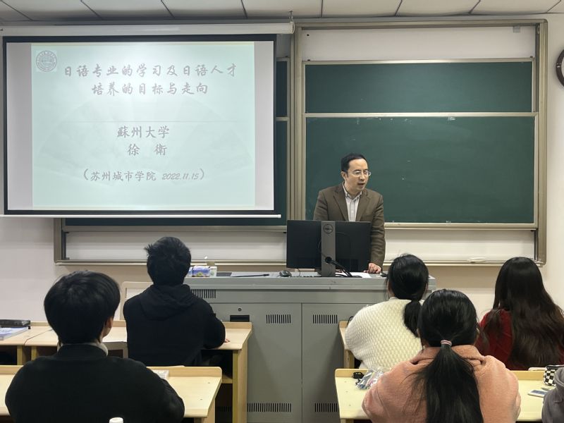 为进一步激发我校日语专业新生学习日语的兴趣和热情,提高自主学习能力,明确未来发展方向,11月15日,外语系邀请苏州大学外国语学院徐卫教授于5-113教室开展《日语专业的学习及日语人才培养的目标与走向》讲座,本次讲座由外语系日语专业负责人潘文东主持。