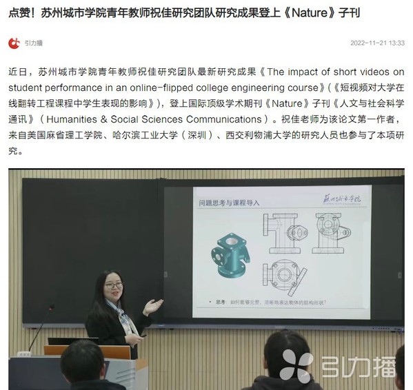 近日,苏州城市学院青年教师祝佳研究团队最新研究成果《The impact of short videos on student performance in an online-flipped college engineering course》(《短视频对大学在线翻转工程课程中学生表现的影响》),登上国际顶级学术期刊《Nature》子刊《人文与社会科学通讯》(Humanities & Social Sciences Communications)。祝佳老师为该论文第一作者,来自美国麻省理工学院、哈尔滨工业大学(深圳)、西交利物浦大学的研究人员也参与了本项研究。