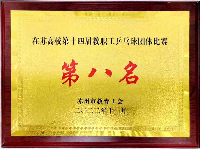 根据苏州市教育工会委员会《关于举办2022年在苏高校第十四届教职工乒乓球比赛的通知》,我校工会积极组队参加。此次比赛共有17个在苏高校参与,我校首次参加,经队员们奋力拼搏,荣获第八名。