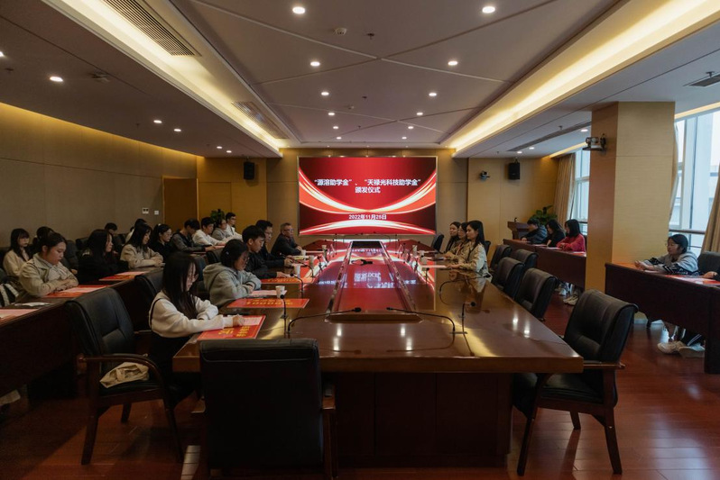 11月25日,“源溶助学金”、“天禄光科技助学金”颁发仪式在我校综合楼大会议室顺利举行。苏州天禄光科技股份有限公司人力资源部经理朱玉兰,苏州小千文化发展有限公司总经理朱雯霄,江苏大千虎皇集团有限公司党支部副书记、工会主席庞敬莲出席仪式,我校党委常委、副校长黄涧秋,发展委员会办公室负责人张海洋,党委学生工作部(学生工作处)负责人卞海勇,奖惩助贷服务中心相关老师,“源溶助学金”、“天禄光科技助学金”全体获助学生参加,仪式由张海洋主持。