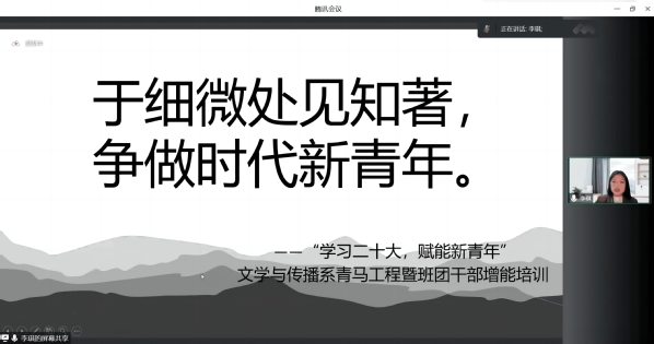 为学习贯彻党的二十大精神,坚定不移地走中国式现代化道路,进一步加强我系的班团干部组织建设,以奋进姿态学习党的二十大精神,充分发挥班委服务班级的作用,文学与传播系借助线上平台开展“学习二十大,赋能新青年”青马工程暨班团干部增能培训活动。