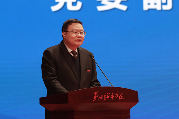 方敏为大家介绍了校徽的设计理念和内涵,方敏表示,他亲历了近些年来学校的变化与发展,非常荣幸能够受邀为学校设计校徽标识。他指出,整个校徽标识突出了“地方性、应用型、开放式、特色化”的办学特色,体现了立足苏州,服务国家战略与区域发展,建设国内一流高水平应用型本科高校的办学目标。