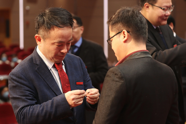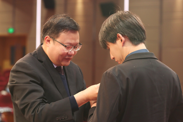 全体校领导为师生代表佩戴校徽。