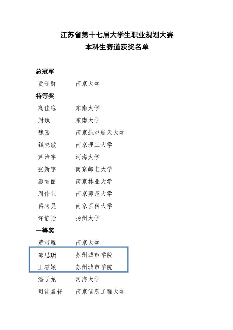 我校历来重视大学生职业生涯规划与指导,9-10月招生就业处联合11个院系面向2019-2021级学生启动了比赛,共有3706名学生参加比赛,在全省高校参赛率中排名第12。10月中旬完成院系初赛和全校决赛书面作品的评阅环节,评选出11名同学进入全校决赛。经过层层选拔和激烈比拼,选拔出3名选手代表学校参加江苏省复赛,其中邵思玥、王睿颖成功晋级江苏省总决赛。在总决赛备赛过程中,统筹资源、集中优势,组建了由苏州市职业大学机电工程学院副院长、全球BCC生涯教练张国良,我校城市文化与传播学院辅导员朱琳和招生就业处负责人宋丹构成的指导队伍,面对时间短、任务重,以及校园封控等困难,对参赛选手从书面作品、视频制作以及现场陈述等方面进行悉心指导。最终,邵思玥、王睿颖两人均在总决赛中荣获一等奖。