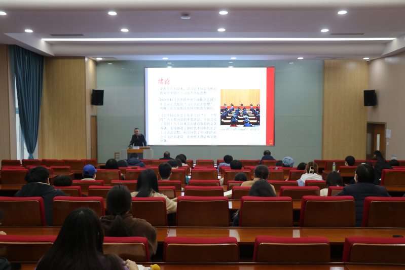 现场,黄涧秋副校长以生动形象的语言、精辟独到的论述、渊博严谨的专业知识,从依法治国“十一个坚持”谈起,向师生介绍了二十大报告中关于依宪治国、依宪执政的有关论述,并从宪法起源、宪法修正历程、宪法的逻辑理据、现行宪法内容等多个方面,就宪法修改背景、加强宪法的实施和监督、贯彻落实举措等内容为大家作了系统的解读和深刻的诠释,通过大量具体而生动的案例,把抽象的宪法理论娓娓道来。进一步强调遵守和维护宪法法律、捍卫宪法尊严的重要意义。对于深入学习、理解掌握宪法精神实质、普及宪法知识和推动宪法实施具有很强的指导意义。