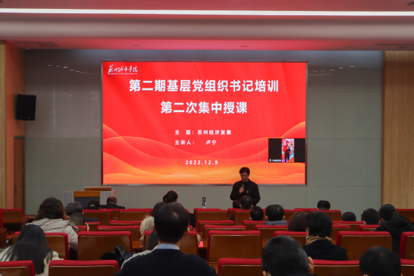 为深入学习宣传贯彻党的二十大精神,不断提高基层党组织书记和干部的素质水平,切实增强基层党组织的政治功能和组织功能,12月9日下午,我校第二期基层党组织书记培训第二次集中授课在3—101举行。苏州市人大议案委主任卢宁围绕苏州经济发展进行线上授课。我校全体基层党组织书记参加培训。本次培训工作由党委组织部胡荣主持。