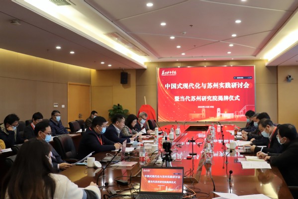 12月10日,为深入学习宣传贯彻党的二十大精神,贯彻落实习近平总书记对中华人民共和国国史学会成立30周年的贺信精神,总结苏州中国式现代化建设的经验和成就,深入研究苏州改革开放史,由苏州城市学院主办、苏州城市学院马克思主义学院、文正智库共同承办的“中国式现代化与苏州实践”研讨会暨当代苏州研究院揭牌仪式顺利举行。苏州市社科联副主席王明国、苏州市委党史工作办公室主任朱江,来自中央党史和文献研究院、中国社会科学院、北京大学、南京大学、华东师范大学、苏州大学的专家学者分别线上线下与会,苏州城市学院党委书记芮国强,党委常委、副校长毛小勇,党委常委、宣传部部长仲宏,学科建设与科研工作处负责人朱跃,发展委员会办公室负责人张海洋,马克思主义学院党政领导及教师出席会议。开幕式由苏州城市学院党委副书记、马克思主义学院党委书记周玉玲主持。