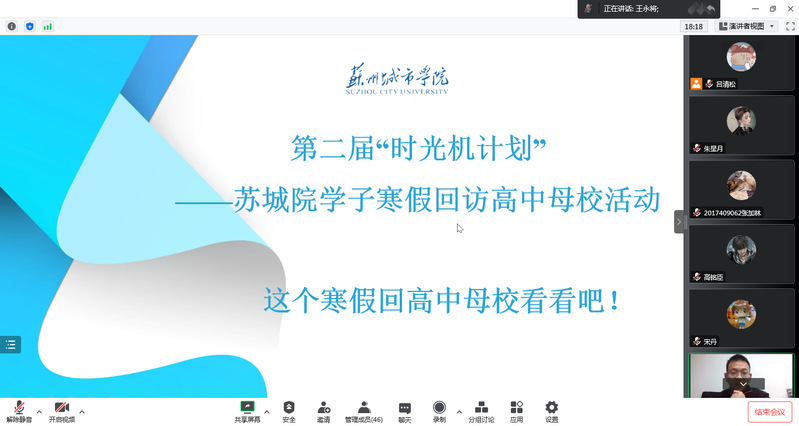 12月15日,我校第二届“时光机计划”——苏城院学子寒假回访高中母校活动出征仪式在线上腾讯会议平台举行。招生就业处负责人宋丹、招生就业处王永将、吕清松以及全体志愿者同学参加,活动由宋丹主持。