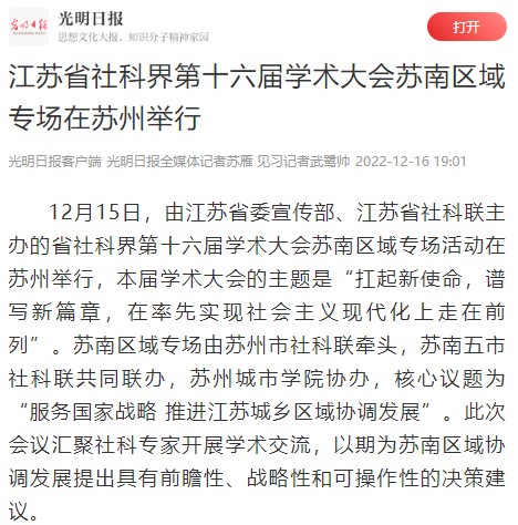 12月15日,由江苏省委宣传部、江苏省社科联主办的省社科界第十六届学术大会苏南区域专场活动在苏州举行,本届学术大会的主题是“扛起新使命,谱写新篇章,在率先实现社会主义现代化上走在前列”。苏南区域专场由苏州市社科联牵头,苏南五市社科联共同联办,苏州城市学院协办,核心议题为“服务国家战略推进江苏城乡区域协调发展”。此次会议汇聚社科专家开展学术交流,以期为苏南区域协调发展提出具有前瞻性、战略性和可操作性的决策建议。