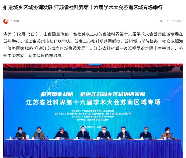 今天(12月15日),由省委宣传部、省社科联主办的省社科界第十六届学术大会苏南区域专场在苏州举行。活动由苏州市社科联牵头,苏南五市社科联共同联办,苏州城市学院协办,核心议题为“服务国家战略推进江苏城乡区域协调发展”。江苏省社科联一级巡视员徐之顺出席并讲话,苏州市委常委、副市长唐晓东致辞。