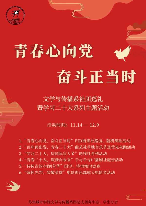 每一个青年,都应主动将个人的奋斗融入国家和民族的奋斗大潮中,将个人的命运与国家和民族的命运紧密相连。文学与传播系所属社团积极响应活动号召,践行青春使命,开展面向全体学生的优质校园文化活动。范仲淹文化研究协会面向全校学生举行了诗词知识竞赛活动,进一步深入学习中华优秀传统文化,丰富大学生古诗文的积累,提高古诗文的阅读兴趣。曲艺社在党的二十大精神的指引下举办了一年一度的“草地音乐节”活动,旨在针对青年特点、把握健康审美的校园艺术活动,助推文明校园建设,促进大学生的全面成长。助残志愿者服务协会通过线上线下双联动的方式,积极开展了一系列以助盲、助残为核心的志愿服务活动,丰富了残障人群的生活,为视听困难的朋友们送去了温暖与关爱。电影俱乐部在主题为“忆往昔峥嵘,绘不变初心”露天电影节活动中选择了红色电影“湄公河行动”,旨在期望新时代青年学习继承发扬革命先烈的不怕牺牲,敢于斗争的精神。