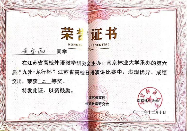 21日语学生黄奕菡(指导教师邓清晨、谢蓉)于12月10日,在由江苏高校外语教学研究会日语分会主办、南京林业大学外国语学院承办、九州外国语学院及江苏龙行教育科技发展有限公司共同协办的第六届“九外・龙行杯”江苏省高校日语演讲比赛中荣获二等奖。