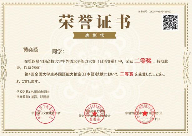 21日语黄奕菡(指导教师谢蓉、邓清晨)、22日语刘靖雯(指导教师谢蓉)在第四届全国高校大学生外语水平能力大赛中从来自全国160余所高校的8千余名学生中脱颖而出,最终双双喜获二等奖。