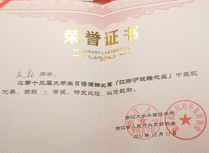 12月11日,由浙江大学与浙江省人民对外友好协会于共同举办的“第十三届大学生日语演讲比赛(江浙沪皖赣地区)”,21日语孟鑫(指导教师贡希真、潘文东)在与各大高校选手同台竞技中脱颖而出,进入决赛并获得三等奖。