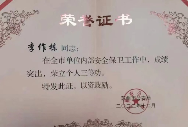近日,苏州市公安局下发文件《关于表彰中国邮政集团有限公司苏州市分公司安全保卫部等70个集体和唐曜等70名同志的决定》(苏公发〔2022〕276号),对2022年度全市内保系统保卫组织先进集体和先进个人进行表彰,我校党委保卫部(保卫处)李作栋同志荣立苏州市公安局单位内部安全保卫工作“个人三等功”。