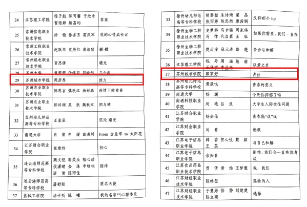 近日,由江苏省教育厅教育宣传中心(江苏教育报刊总社)面向全省高校开展“青春新形象 健康‘心’征程”大学生心理健康教育短视频活动结果揭晓。各高校积极响应,组织师生踊跃参加,共报送心理健康教育短视频数百个。经三轮评选,我校学子周彦昂作品《接力》、郭家妤作品《占位》分别荣获二等奖、三等奖。