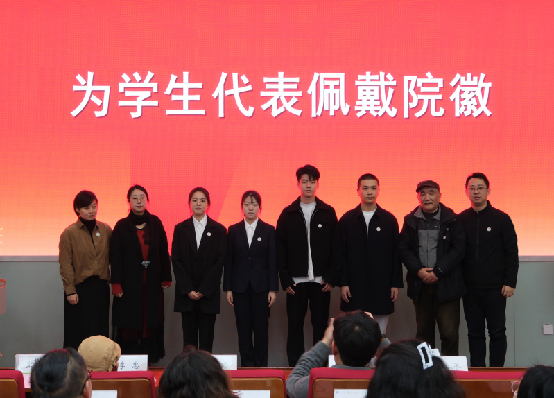 马路,丁良超,教师代表程承、罗昭信一同为学生代表佩戴院徽。