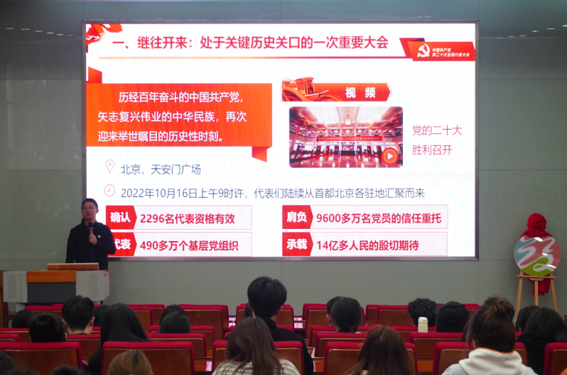 丁良超以“不同的国家在相同或类似政治制度下为什么产生不同政治效果”这一问题引出本次宣讲内容,并从“处于关键历史关口的一次重要会议”“几个关键词带你了解党的二十大”“过去五年工作情况和新时代十年成就”“以中国式现代化全面推进中华民族伟大复兴”以及“为全面建设社会主义现代化国家而团结奋斗”这五个部分逐一进行论述。
