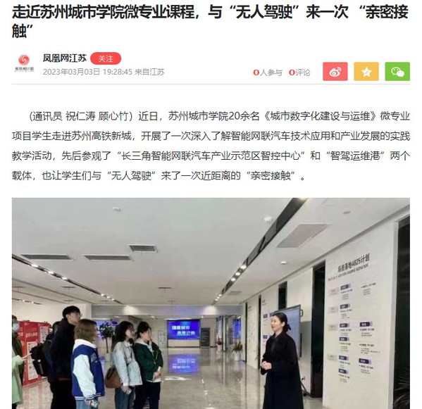 近年来,苏州市相城区前瞻布局智能车联网产业,着力构建具有影响力的智能车联网产业创新集群,先后获批江苏首批车联网先导区、首个数字交通示范区,产业规模逐步壮大,应用场景全国领先,融合发展生态持续优化,在国内该领域实现快速突围并占据领先位次,是苏州市发展“新基建”的典型实践案例。因此,苏州城市学院与苏州市产业园发展促进会共同策划设计了以“智能网联汽车”为主题的实践课程,作为双方合作的《城市数字化建设与运维》微专业项目五门课程之一的《数字经济下的新基建与新城建》理论课的课外补充,带领学生实地参观相城区高铁新城片区的智能网联汽车相关载体。
