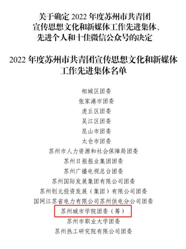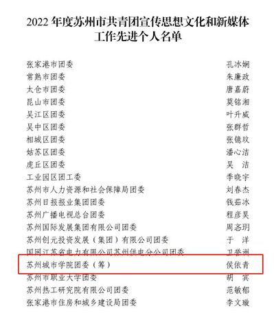 近日,苏州团市委印发《关于确定2022年度苏州市共青团宣传思想文化和新媒体工作先进集体、先进个人和十佳微信公众号的决定》(团苏委〔2023〕22号),我校团委(筹)获评2022年度苏州市共青团宣传思想文化和新媒体工作“先进集体”,校团委(筹)侯依青老师获评2022年度苏州市共青团宣传思想文化和新媒体工作“先进个人”。