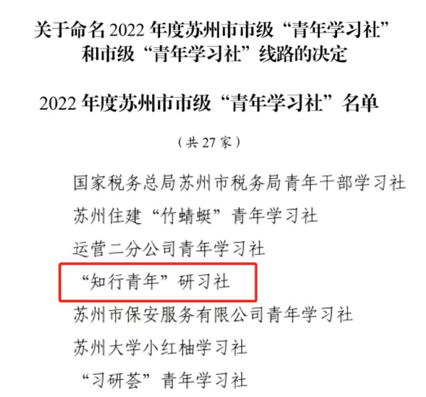 近日,苏州团市委印发《关于命名2022年度苏州市市级“青年学习社”和市级“青年学习社”线路的决定》(团苏委〔2023〕23号),我校团委(筹)“知行青年”研习社被命名2022年度苏州市市级“青年学习社”。