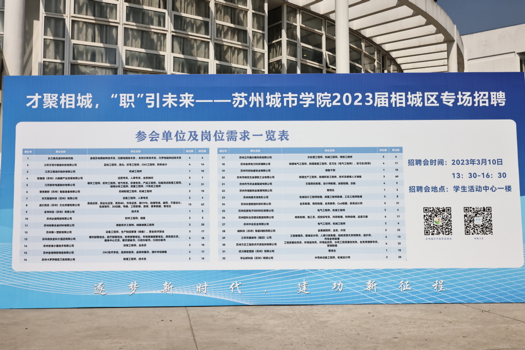为认真贯彻落实党中央、国务院“稳就业”“保就业”决策部署,抢抓春季开学后促就业关键期,促进毕业生顺利毕业、尽早就业。我校于3月10日下午在学生活动中心一楼举办“才聚相城,‘职’引未来——苏州城市学院2023届相城区专场招聘会”。