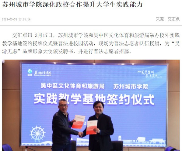 3月17日,苏州城市学院和吴中区文化体育和旅游局举办校外实践教学基地签约授牌仪式暨普法进校园活动,现场为普法志愿者队伍授旗,为“吴游无虑”品牌形象大使颁发聘书,并进行普法志愿者招募。