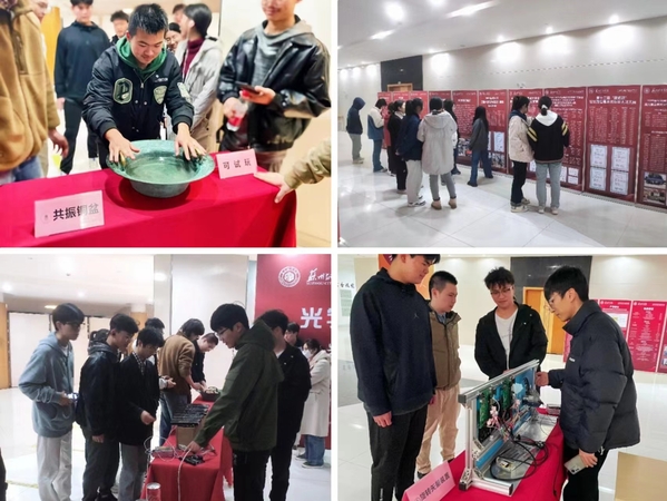 本次展览重点展示了学院在产教融合、学科建设、师生科研成果、学生竞赛、学生升学等方面成果。展览采用展板、科创实物展示、互动体验等形式,以更为直观、鲜明、多元的方式展示学院成立一年来师生取得的成果。本次展览吸引众多同学观展,每个作品都配置了讲解员,让同学们能够近距离了解科创作品,提高学生对科研创新的兴趣。在体验区,学生在工作人员的引导下亲身体验,感受奇妙的物理现象。