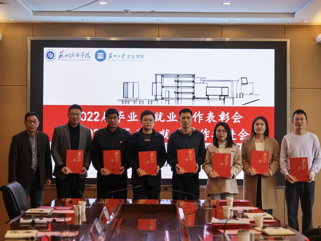 宋丹宣读《关于表彰“苏州城市学院2022届毕业生就业工作先进个人”的决定》,吴昌政为受表彰的班主任代表颁发荣誉证书。