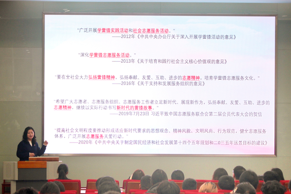 林慧平从雷锋精神和志愿精神的关系、志愿精神的内涵、培育志愿精神的路径三个模块,深刻阐释了雷锋精神、志愿精神的内涵外延,进一步帮助同学们体悟雷锋精神和志愿精神的内在关联。同时,她详细梳理了大学生志愿服务的现状特点,运用典型案例剖析部分大学生在思想、行动层面存在的现实问题,强调要加强对志愿精神的理论认知和情感认同,坚定志愿精神的意志,自觉践行志愿精神。最后,她从苏州博物馆志愿讲解员的亲身经历出发,号召全体同学加入志愿者队伍,积极在参与大型公共服务中培育社会责任感、在对社会贡献中培育奉献精神、在对志愿服务对象的关爱中培育友爱互助精神、在志愿服务的艰难险阻中培育坚强勇敢品质。