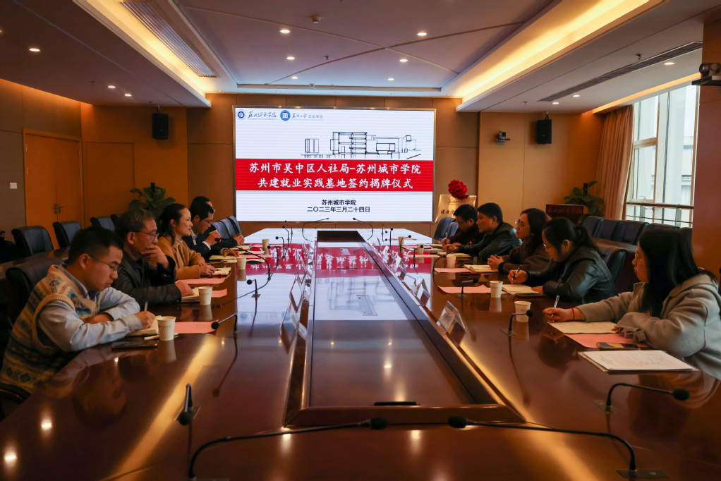 吴中区人社局人管中心主任吴岩、副主任钟惠、副主任李静、人才服务科尹松、人事代理科陆晓青等一行五人来我校参加共建仪式,我校招生就业处副处长宋丹,教务处副处长顾荣庆,教务处实习中心负责人黄新,教务处迮宇,招生就业处朱冯参与座谈交流,会议由宋丹主持。