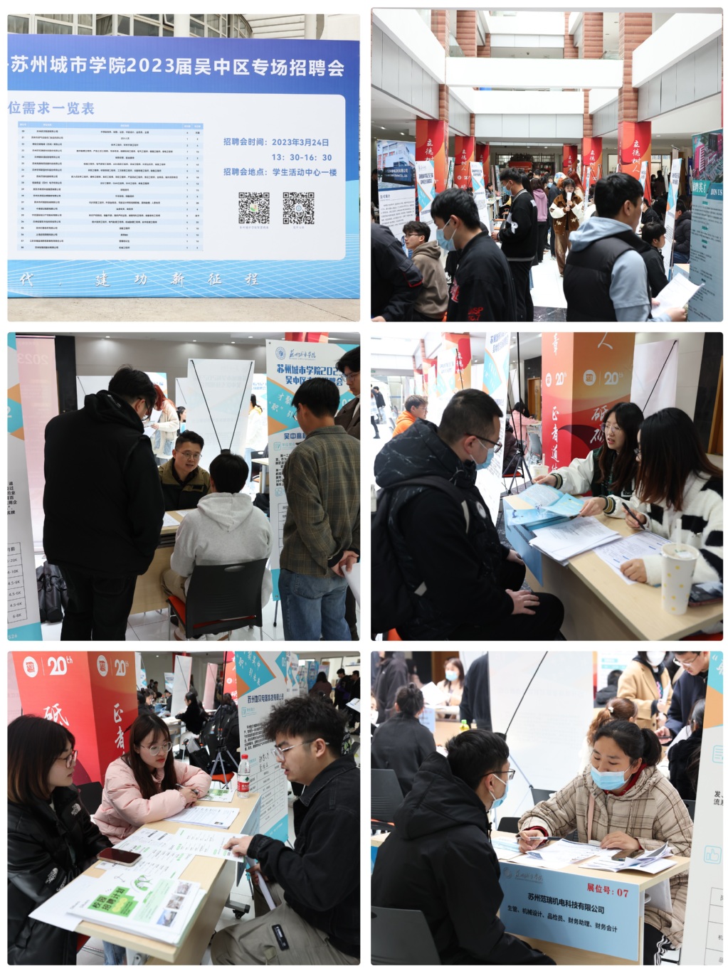 双方就人才培养、实习实践和创新创业等方面展开交流讨论。签约当天,学校举办“才聚吴中,‘职’引未来”——苏州城市学院2023届吴中区专场招聘会,参展企业38家,累计提供岗位144个,职位数630余个,涉及制造业、商务服务业、教育、信息传输、软件和信息技术服务业等多个行业,招聘会共收集简历549份,初步达成就业意向94人。