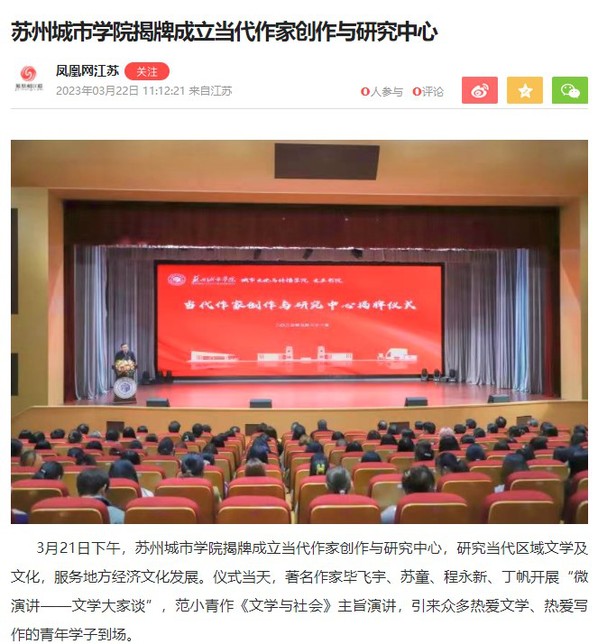 3月21日下午,苏州城市学院揭牌成立当代作家创作与研究中心,研究当代区域文学及文化,服务地方经济文化发展。仪式当天,著名作家毕飞宇、苏童、程永新、丁帆开展“微演讲——文学大家谈”,范小青作《文学与社会》主旨演讲,引来众多热爱文学、热爱写作的青年学子到场。