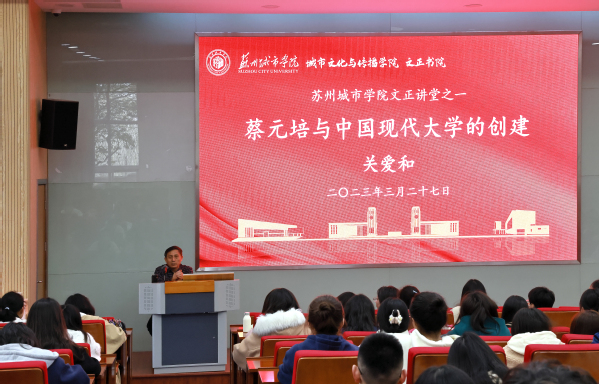3月27日下午,苏州城市学院文正讲堂第一讲在3-101教室举行。河南大学二级教授、博士生导师,河南大学原校长、党委书记,中国近代文学学会会长关爱和教授为我校师生作题为《蔡元培与中国现代大学的创建》的专题讲座。城市文化与传播学院党委副书记、副院长陈国安,文学与传播系副主任涂小马及学院部分师生参加了讲座。涂小马主持了讲座。