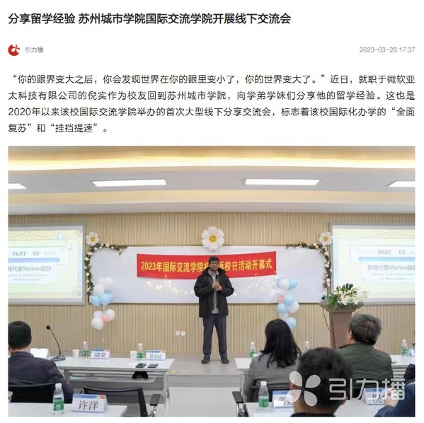“你的眼界变大之后,你会发现世界在你的眼里变小了,你的世界变大了。”近日,就职于微软亚太科技有限公司的倪实作为校友回到苏州城市学院,向学弟学妹们分享他的留学经验。这也是2020年以来该校国际交流学院举办的首次大型线下分享交流会,标志着该校国际化办学的“全面复苏”和“挂挡提速”。