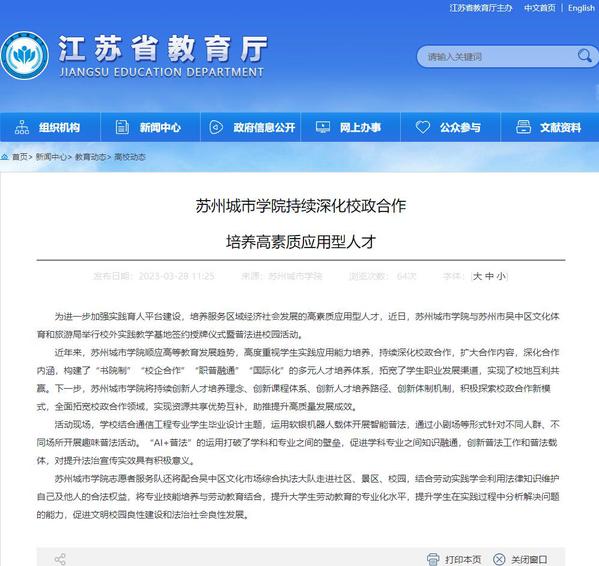 近年来,苏州城市学院顺应高等教育发展趋势,高度重视学生实践应用能力培养,持续深化校政合作,扩大合作内容,深化合作内涵,构建了“书院制”“校企合作”“职普融通”“国际化”的多元人才培养体系,拓宽了学生职业发展渠道,实现了校地互利共赢。下一步,苏州城市学院将持续创新人才培养理念、创新课程体系、创新人才培养路径、创新体制机制,积极探索校政合作新模式,全面拓宽校政合作领域,实现资源共享优势互补,助推提升高质量发展成效。