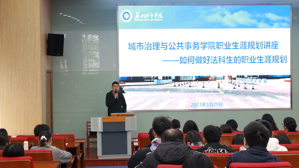 3月29日下午,由城市治理与公共事务学院主办的“寻梦而行 职争朝夕”职业生涯规划主题讲座在3号楼101成功举办。讲座由苏州工业园区人民法院刑事审判庭副庭长陈洁主讲,学院相关辅导员、2020级法学专业全体学生参加,讲座由学院学生工作负责人申毅主持。