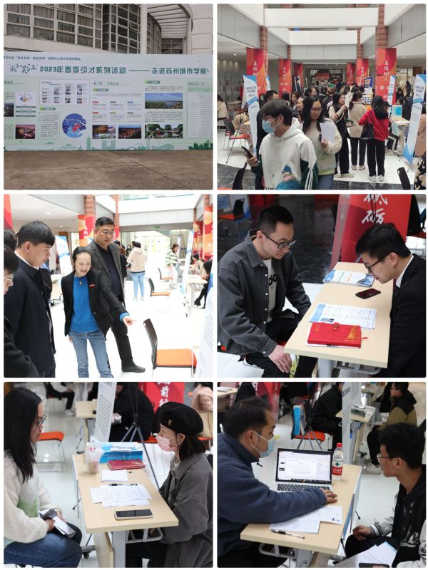双方就人才培养、就业见习、实习实践等方面展开交流讨论。签约当天,学校举办“才聚吴江,‘职’引未来”——苏州城市学院2023届吴江区专场招聘会。参展企业22家,累计提供岗位100个,职位数583个,涉及制造业、商务服务业等行业,招聘会共收集简历187份,初步达成就业意向43人。