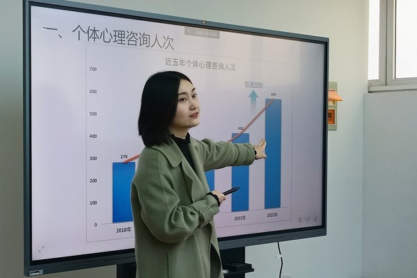 潘芝颖对苏州城市学院近五年个体心理咨询情况进行整体汇报。她从个体心理咨询人次、续约率、学生来访问题分布、咨询师配备等四个方面展开介绍。